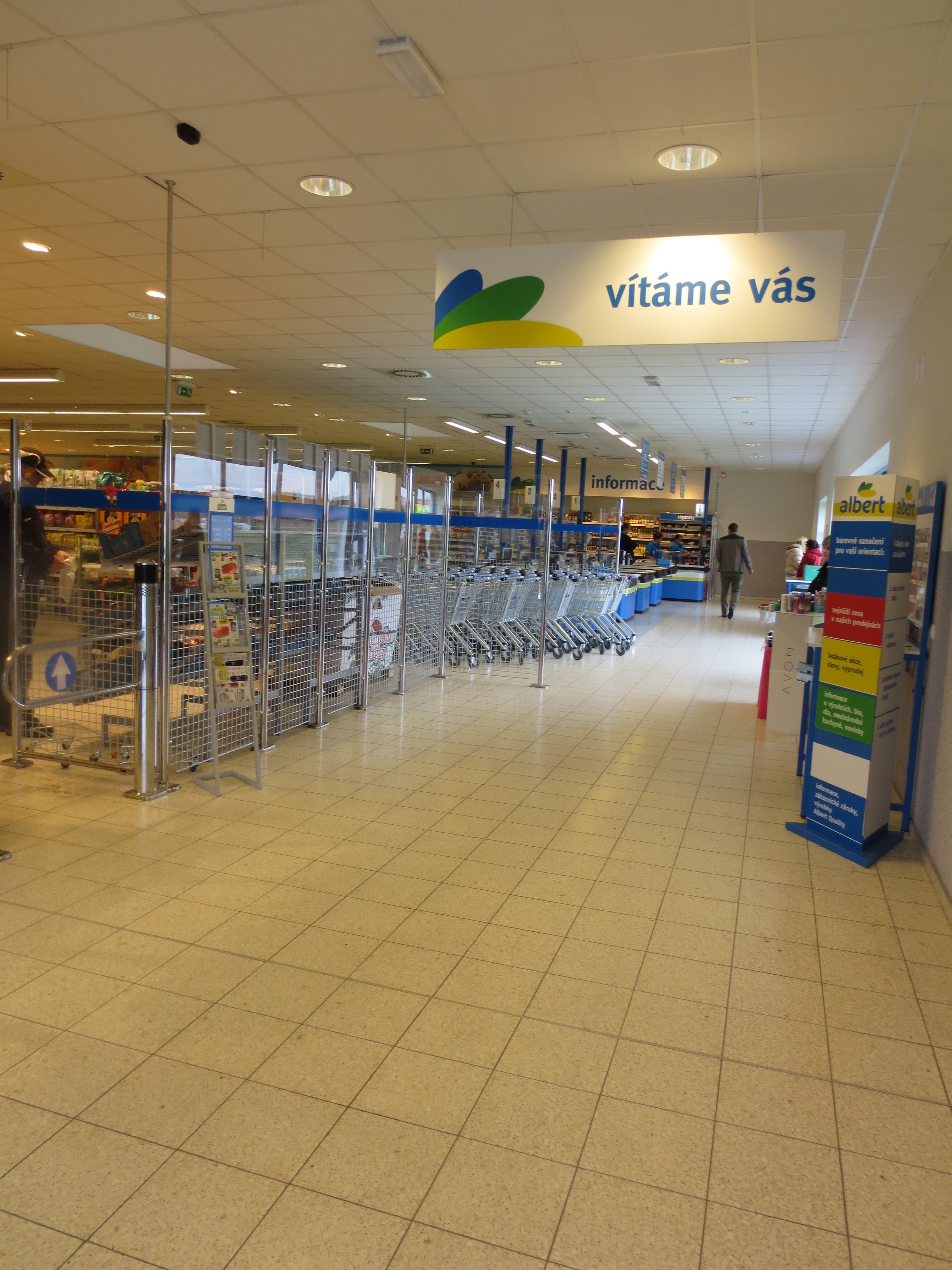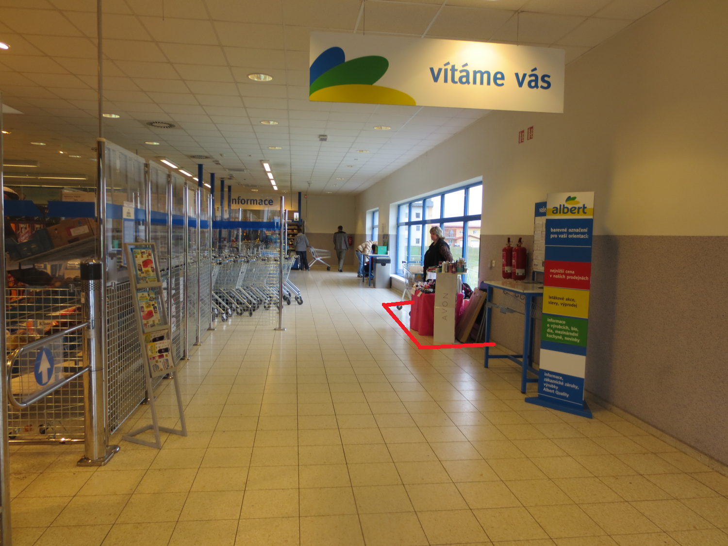 Plocha mezi vstupem do prodejny Albert a pokladní zónou.