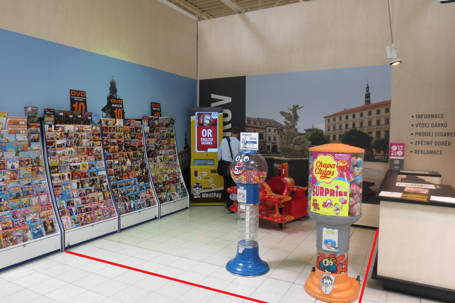 ZÁKAZ PRODEJE KOSMETIKY na této ploše. Plocha nacházející se vedle informací. Pro vystavení zboží lze použít i přilehlou zeď (viz obrázek).4 m²